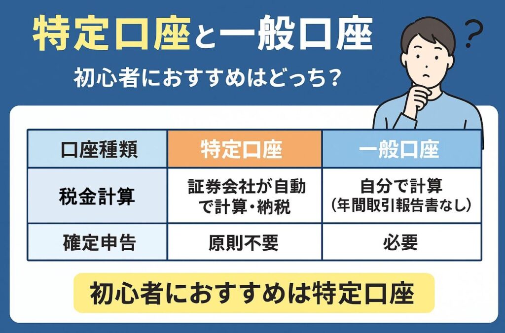 - 初心者は迷わず「特定口座(源泉徴収あり)」を選ぶのがおすすめ